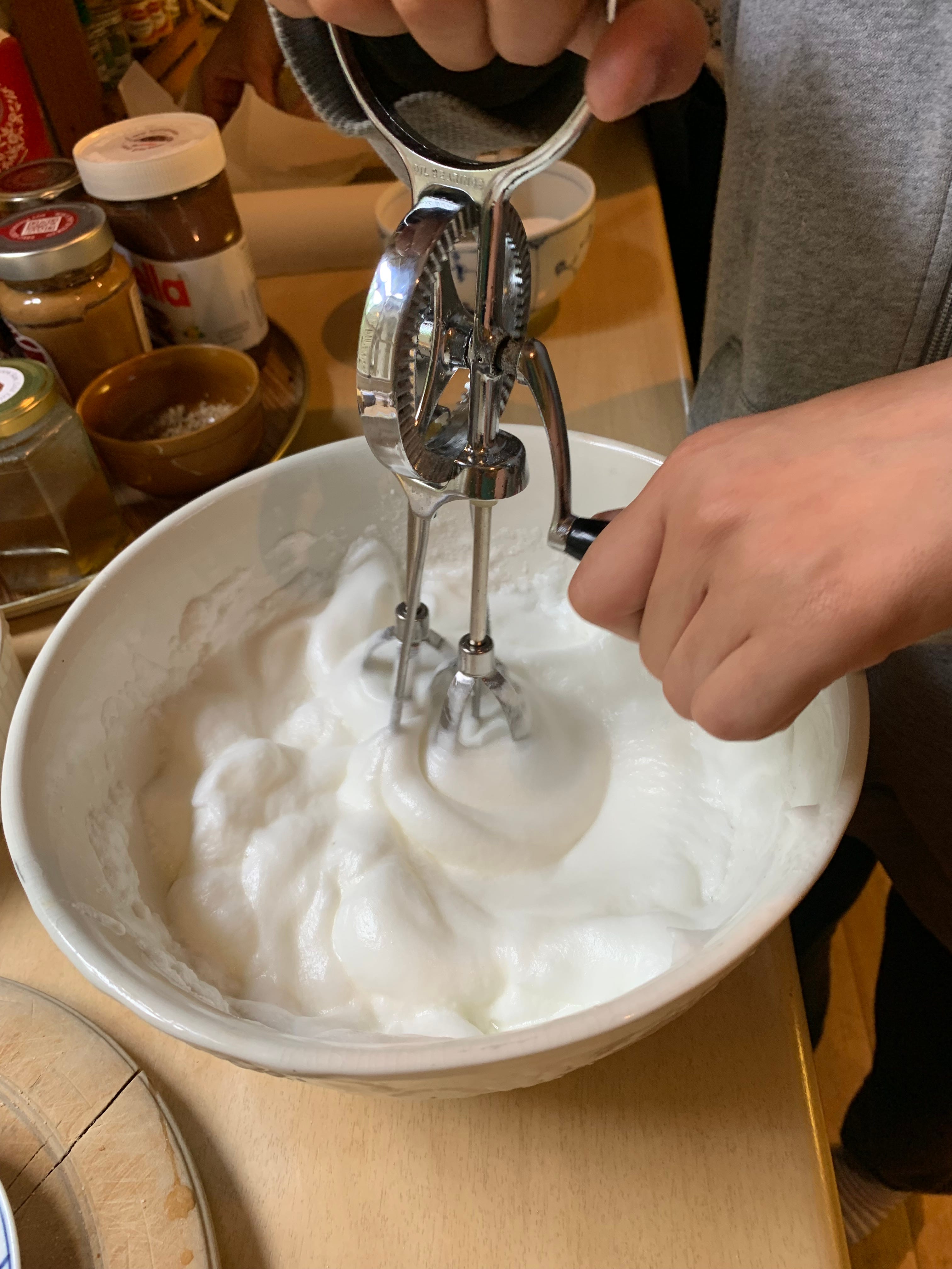 Many of the possessions in our mother’s house caused me and my sister agonies before we let them go but getting rid of the rotary whisk felt like an easy decision for the simple reason that I have a long-held prejudice against them. I never thought that rotary whisks were very good at whisking. When I first left home, I became a balloon whisk person and never looked back. Balloon whisks were what I had seen chefs using on TV, lifting the egg whites high in the air with a confident circular motion. Any time I wanted to whisk something faster, I would reach for my hand-held electric whisk.