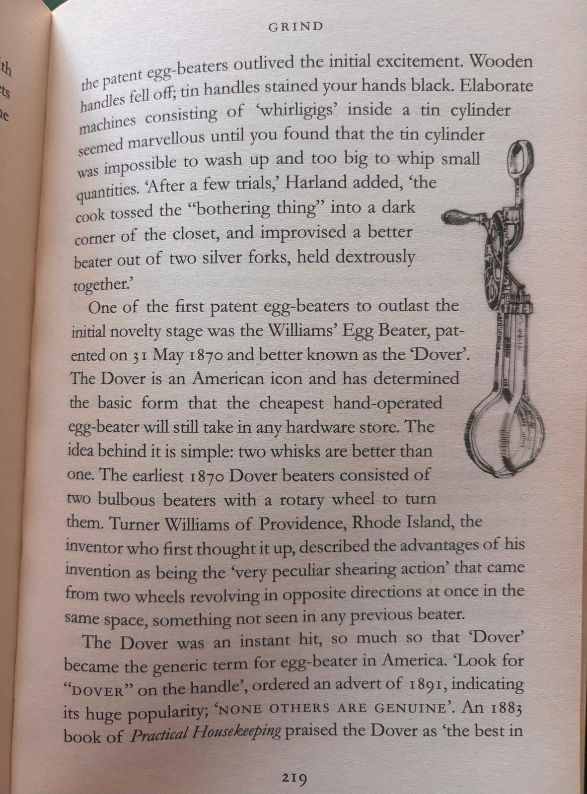 I find it astonishing to think that between 1856 and 1920, no fewer than 692 separate patents were granted for egg-beaters in the U.S. Some of the inventions sound wonderfully strange. I wish I could try one of the water-operated egg whisks, hooked up to running water.
