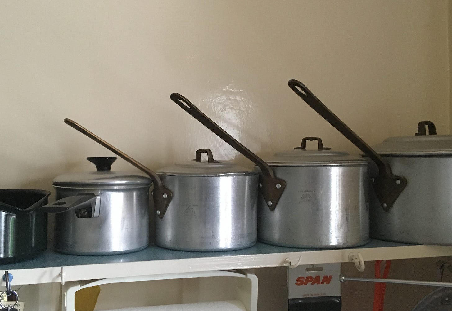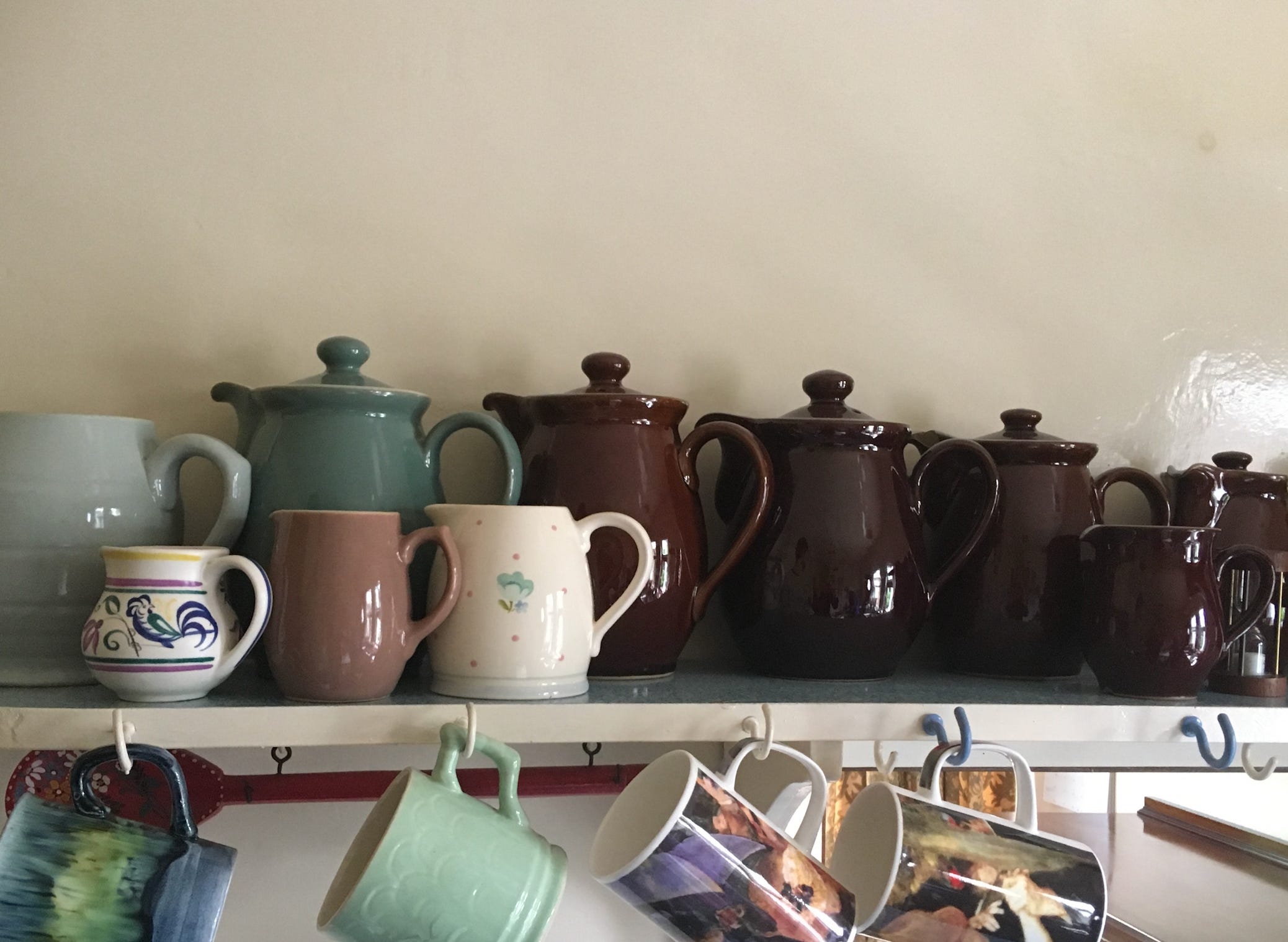 I inherited one of Anthea’s brown coffee pots after she died and when I hold it, I feel her goodness. If I could have written another chapter of my book THE HEART-SHAPED TIN, it might have been about this coffee pot which so much feels like an extension of its owner (like the coffee pots, Anthea was often dressed in brown although she favoured camel jumpers and tweed skirts rather than the glossy chestnut brown of the pots). I adored the orderly but modest kitchen of her bungalow and the way her saucepans were always lined up so neatly.