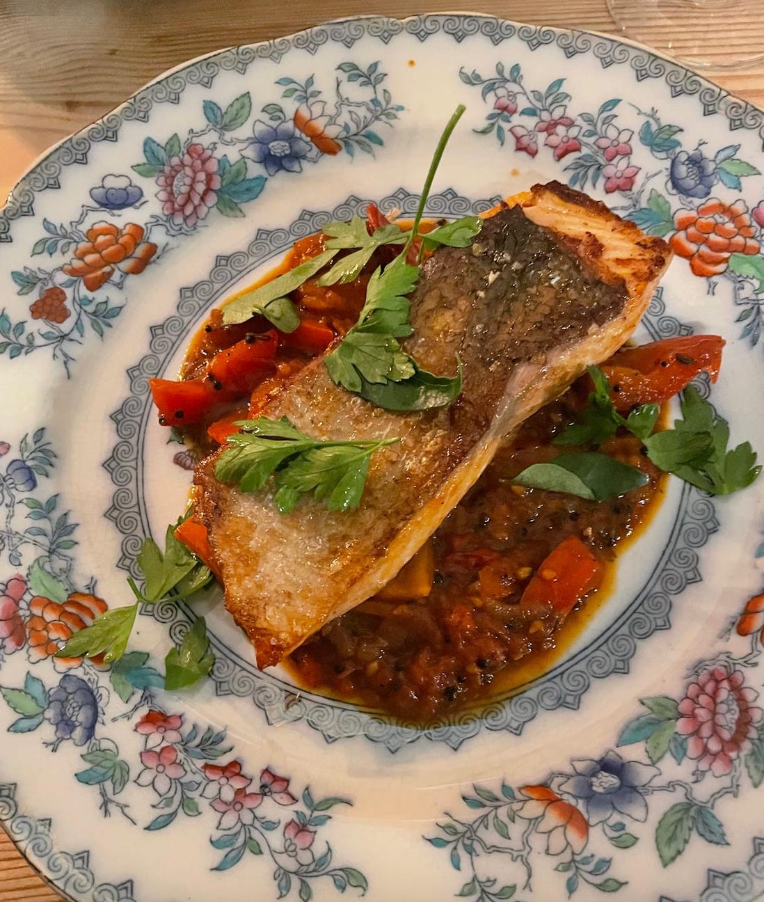 Another reason why Anthea was on my mind was because something she loved to eat was a piece of plain cooked fish. She was a person of very sparing appetites - cake aside - and could happily lunch on half a piece of poached salmon. But she also liked fish with hollandaise on more celebratory occasions such as Easter. I suddenly wished that she were alive again because FINALLY, for the first time in my life, I have a method for cooking a really simple piece of pan-fried skin-on fish - I’ve mostly been using this method for Chalk Stream trout - which works every time and I wish I could make it for her. Instead, I’ll put the brown coffee pot on the table and imagine that she is with us still.