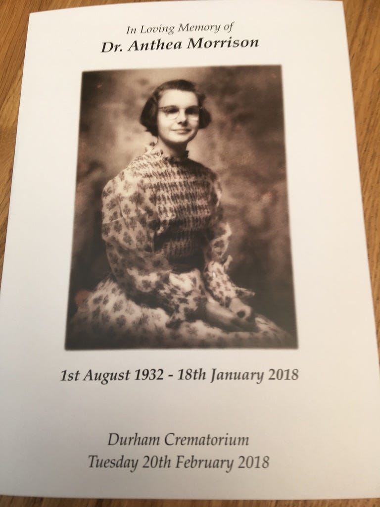 I got to know Anthea because she was a friend and former student of my Granny’s. When my Granny fell ill, apparently terminally, Anthea travelled from Durham to Cambridge to visit her. The doctors gave my Granny a week to live; and she kept saying she was ready to die. But she lived for another eight years! And for all that time, except for a few short breaks to return to Durham, Anthea stayed with her, giving my Granny a whole new life she never could have had otherwise.