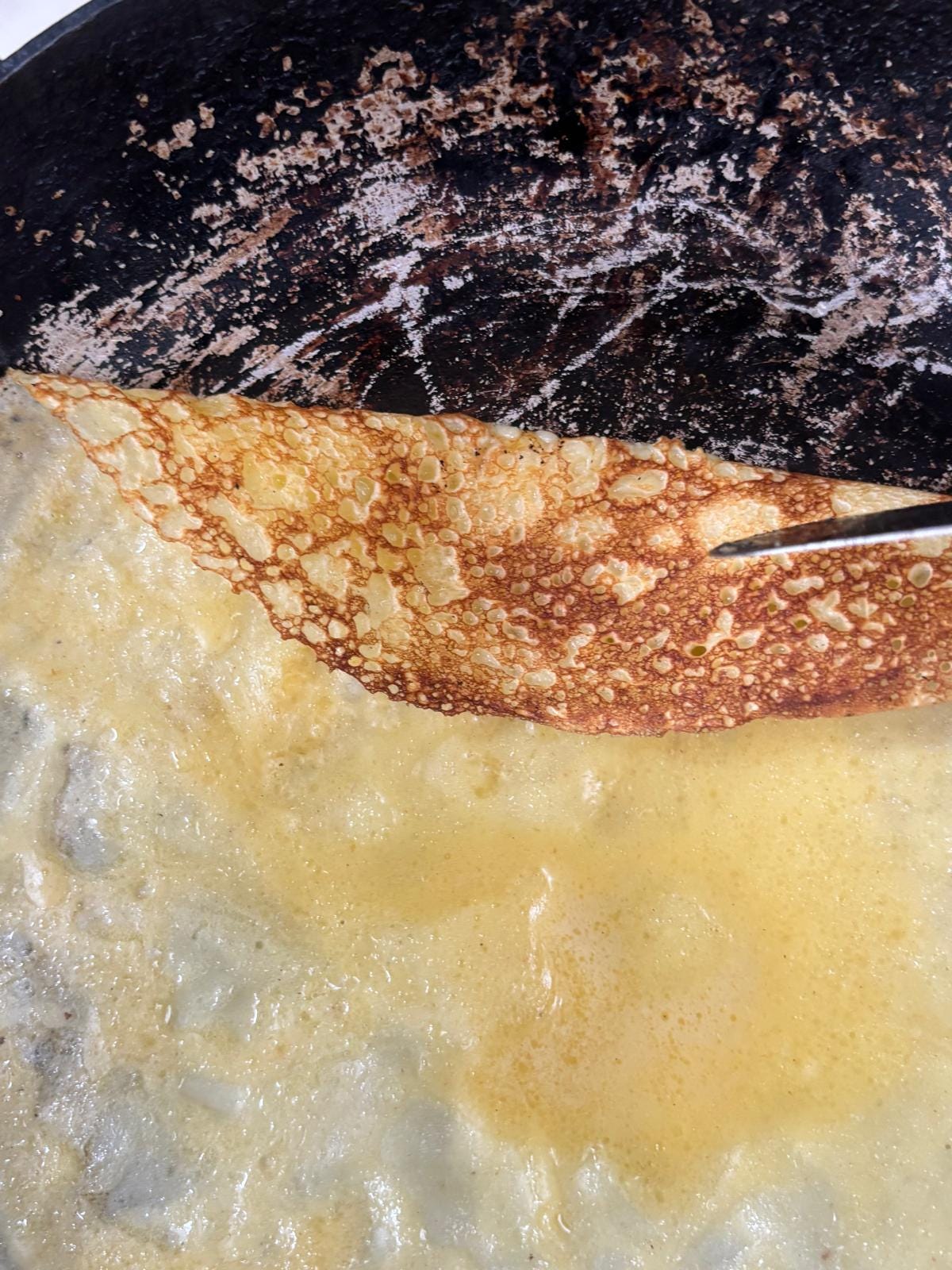 This shuffling sound tells you that the pancake is totally dry underneath and won’t stick when you try to toss it (though accidents do still happen, which is part of the fun). Because I am now a boring middle aged person who cares more about eating tender pancakes than I do about the drama of tossing, I am now in camp ‘Turn’ which allows me to flip the crêpe a bit sooner and thus overcook it less than when I am tossing it.